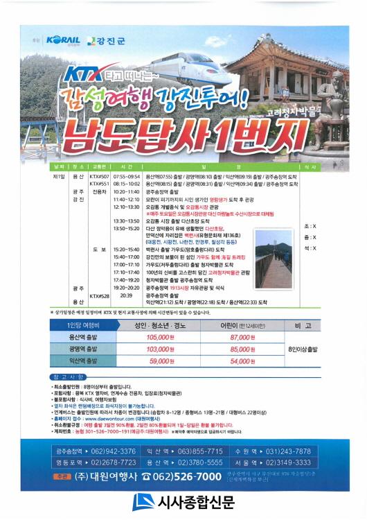 ÄÚ·¹ÀÏ ±¤ÁÖº»ºÎ¿¡¼´Â Áö³ 13ÀÏ ¡®KTX Ÿ°í ¶°³ª´Â °¨¼º¿©Çà °ÁøÅõ¾î! ³²µµ´ä»ç 1¹øÁö¡¯ ¿©Çà»óǰÀ» Ãâ½ÃÇß´Ù. ÀÌ »óǰÀº ÄÚ·¹Àϰú ´ë¿ø¿©Çà»ç°¡ ÁÖ°üÀ¸·Î ¼¿ï¿ë»ê¿ª¿¡¼ Ãâ¹ßÇØ °æ±â±¤¸í¿ª, ÀüºÏÀͻ꿪À» °æÀ¯ÇØ ±¤ÁÖ¼ÛÁ¤¿ª¿¡¼ Àü¿ë ¹ö½º¸¦ Ÿ°í °ÁøÀ» ¿À°¡´Â ¿©Çà»óǰÀ¸·Î KTX¸¦ Ÿ°í ³²µµ¿¡ ³»·Á¿Í ½Åºñ·Î¿î °ÁøÀÇ º¸¹°À» ã°í Ãß¾ïÀ» ¸¸³£ÇÒ °ÍÀ¸·Î ±â´ëµÈ´Ù.