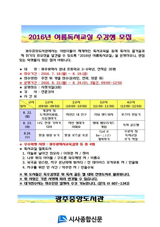 [±¤ÁÖ/½Ã»çÁ¾ÇսŹ®]¿ÀÁ¤±Ù ±âÀÚ = ±¤ÁÖÁß¾Óµµ¼°ü(°üÀå À̶û¼ø)ÀÌ 8¿ù22ÀϺÎÅÍ 3Àϰ£ ÃʵîÇб³ 3~6Çгâ ÇлýµéÀ» ´ë»óÀ¸·Î 2016³â ¿©¸§µ¶¼±³½ÇÀ» ¿î¿µÇÑ´Ù°í ¹àÇû´Ù.