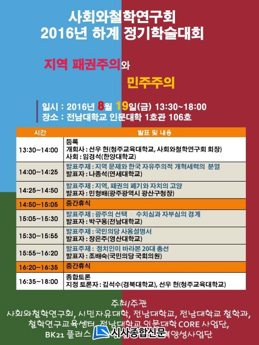 »çȸ¿ÍöÇבּ¸È¸(ȸÀå ¼±¿ìÇö), öÇבּ¸±³À°¼¾ÅÍ(¼¾ÅÍÀå ¾ç¼øÀÚ), Àü³²´ëÇб³ öÇаú, Àü³²´ëÇб³ Àι®´ëÇÐ CORE(Àι®¿ª·®°È»ç¾÷) »ç¾÷´Ü(´ÜÀå ±è¾çÇö), BK21Ç÷¯½º Ⱦ´ÜÇü öÇÐÀü¹®Àη¾缺»ç¾÷´Ü(´ÜÀå ³ë¾çÁø), ±¤ÁֽùÎÀÚÀ¯´ëÇÐÀº 8¿ù 19ÀÏ(±Ý) ¿ÀÈÄ 1½Ã30ºÐºÎÅÍ 6½Ã±îÁö Àü³²´ëÇб³ Àι®´ëÇÐ 1È£°ü ÀÌÀ»È£°ÀǽÇ(106È£)¿¡¼ ¡®»çȸ¿ÍöÇבּ¸È¸ 2016³â Çϰè Á¤±âÇмú´ëȸ¡¯¸¦ °³ÃÖÇÑ´Ù.