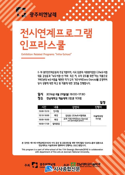 À̹ø ÀÎÇÁ¶ó½ºÄð¿¡¼´Â 9¿ù 2ÀÏ(±Ý) °³¸·ÇÏ´Â 2016±¤ÁÖºñ¿£³¯·¹ Âü¿©ÀÛ°¡ µµ¶ó °¡¸£½Ã¾Æ(Dora Garcia, ½ºÆäÀÎ ¹Ù¸£¼¿·Î³ª Ãâ½Å)¿Í ±è»óÀ± ¿¾ ³ìµÎ¼Á¡ ´ëÇ¥ÀÇ °¿¬ÀÌ ÀÖÀ» ¿¹Á¤ÀÌ´Ù. µµ¶ó °¡¸£½Ã¾Æ´Â À̹ø ºñ¿£³¯·¹¿¡ '³ìµÎ¼Á¡ - »ê ÀÚ¿Í Á×Àº ÀÚ, ¿ì¸® ¸ðµÎ¸¦ À§ÇÑ'À̶ó´Â ÀÛǰÀ» ÃâǰÇÑ ¹è°æ°ú 36³â ÀüÀÎ 1980³â 5¡¤18 ´ç½Ã °Ý¹®°ú Åõ»çȸº¸ µîÀ» ¸¸µé¾î ¹èÆ÷Çß´ø ¡®³ìµÎ¼Á¡¡¯ÀÇ È°µ¿»ó¿¡ ´ëÇØ °¿¬ÇÑ´Ù. ±è»óÀ± ¿¾ ³ìµÎ¼Á¡ ´ëÇ¥µµ 80³â 5¿ù ´ç½Ã »óȲ¿¡ ´ëÇÑ »ý»ýÇÑ Áõ¾ð°ú üÇè´ãÀ» µé·ÁÁÙ ¿¹Á¤ÀÌ´Ù.