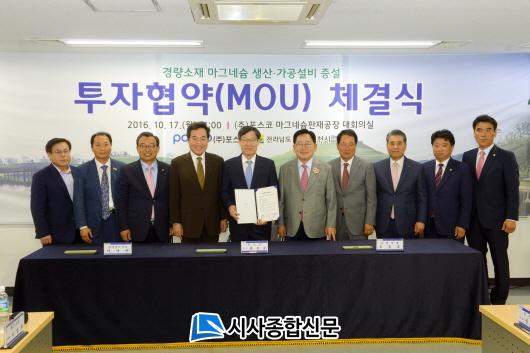 Çù¾à¿¡ µû¶ó (ÁÖ)Æ÷½ºÄÚ´Â ÇØ·æ»ê´Ü 6¸¸ 6õ 118§³ÀÇ ºÎÁö¿¡ Áö³ 2007³âºÎÅÍ °¡µ¿Çؿ ¸¶±×³×½· ÆÇÀç°øÀå¿¡ Ãß°¡ ÅõÀÚ¸¦ ÅëÇØ 1õ 700mm ÀÌ»óÀÇ ¸¶±×³×½· ±¤ÆøÆÇÀ縦 »ý»ê․°¡°øÇÏ´Â ±¤Æø ¾Ð¿¬±â ¹× ÈÄ °øÁ¤, ºô·¿ ¿¬¼ÓÁÖÁ¶±â µîÀÇ ¼³ºñ¸¦ Áõ¼³ÇÑ´Ù. ÀÌ ½Ã¼³ÀÌ ¿Ï°øµÇ¸é Áö¿ª ÁֹΠ100¿© ¸íÀÌ »õ·Î¿î ÀÏÀÚ¸®¸¦ °®°Ô µÅ ¡®Ã»³âÀÌ µ¹¾Æ¿À´Â Àü³²¡¯ ½ÇÇö°ú ±¹³»¿Ü ¸¶±×³×½· ÆÇÀç ¼ö¿ä Áõ°¡¿¡ ÁÖµµÀû ¿ªÇÒÀ» ¼öÇà, ½ÃÀåÀ» ¼±Á¡ÇÒ °ÍÀ¸·Î ±â´ëµÈ´Ù. ÀÌ¿¡ µû¶ó Àü¶ó³²µµ´Â Á¤ºÎÀÇ °æ·®¼ÒÀç ÇÁ·ÎÁ§Æ®¿¡ ¸ÂÃç ¸¶±×³×½· ¼ÒÀ縦 ½Å¼ºÀå µ¿·ÂÀ¸·Î À°¼ºÇϱâ À§ÇØ, ½Å¼ÒÀç¼¾ÅÍ¿Í ÇÔ²² ÀüÈĹæ Áß¼Ò±â¾÷À» ¹ß±¼Çϰí Á¤ºÎÀÇ ¸¶±×³×½· ±â¼ú¿¬±¸°³¹ß °ø¸ð»ç¾÷¿¡µµ Àû±Ø Âü¿©ÇÒ °èȹÀÌ´Ù.