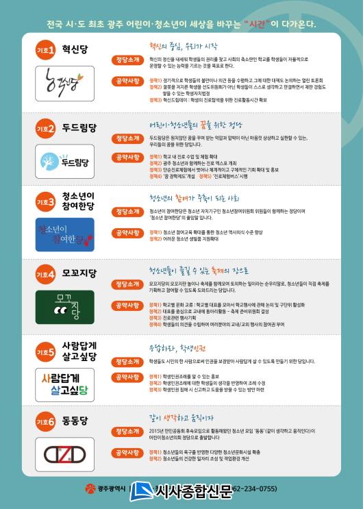 ±¤Áֽà û¼Ò³âÀ¯±ÇÀÚ 18¸¸¿© ¸í Áß 9425¸í(5.2%)ÀÌ ÁöÁöÇÏ´Â Á¤´ç¿¡ ¼ÒÁßÇÑ 1Ç¥¸¦ Çà»çÇß´Ù. ±× °á°ú ¡®µÎµå¸²´ç¡¯ 2025Ç¥(22%)¿Í ¡®¸ð²¿Áö´ç¡¯ÀÌ 2200Ç¥(24%)¸¦ °¢°¢ ¾ò¾î 5¼®ÀÇ ÀǼ®À» È®º¸ÇØ ¿ø³» Á¦1´çÀÌ µÆ´Ù. À̾î, ¡®»ç¶÷´ä°Ô »ì°í½Í´ç¡¯ÀÌ 1541Ç¥(16%)·Î 4¼®,¡®Ã»¼Ò³âÀÌ Âü¿©ÇѴ硯ÀÌ 1422Ç¥(15%), µ¿µ¿´çÀÌ 1081Ç¥(12%)·Î °¢ 3¼®, ¡®Çõ½Å´ç¡¯ÀÌ 1041Ç¥(11%)·Î 2¼®À» È®º¸Çß´Ù. ºñ·Ê´ëÇ¥ ÀÇ¿ø 22¸íÀº ÃʵîÇб³ 3ÇгâºÎÅÍ °íµîÇб³ 2Çгâ±îÁö ´Ù¾çÇÑ ¿¬·ÉÀ¸·Î ±¸¼ºµÆ´Ù.