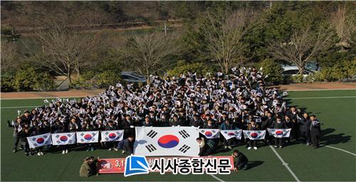 Çà»ç´Â Çлýµé°ú ¼±»ý´ÔµéÀÌ ÇÔ²² Âü¿©ÇØ ¾ç¼Õ¿¡ űر⸦ µé°í ¡°´ëÇѵ¶¸³ ¸¸¼¼¡±¸¦ ¿ÜÄ¡¸é Àü³²±³À°Ã»¿¡¼ ¹®ÅÂ°í ¿îµ¿Àå±îÁö 7km°Å¸®¸¦ ÇàÁøÇϸç, »ïÀÏÀý Àǹ̸¦ µÇ»õ°å´Ù.