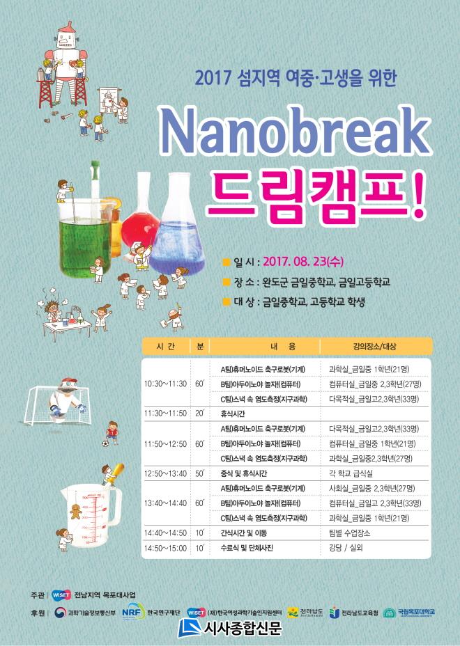 [¸ñÆ÷/½Ã»çÁ¾ÇսŹ®]¹ÚµÎ¸¸ ±âÀÚ = WISETÀü³²Áö¿ª¸ñÆ÷´ë»ç¾÷(´ÜÀå ¹Úº¹Èñ)Àº ¿À´Â 8¿ù 23ÀÏ(¼ö) ¿Ïµµ±º ±ÝÀÏÁßÇб³(±³Àå ¹Ú¿µÈ£)¿Í ±ÝÀϰíµîÇб³(±³Àå ÃÖ¿µ¹Î)¸¦ ¹æ¹®ÇØ Àü±³»ýÀ» ´ë»óÀ¸·Î¡®2017 ¼¶ Áö¿ª Nanobreak µå¸²Ä·ÇÁ¡¯¸¦ °³ÃÖÇÑ´Ù.