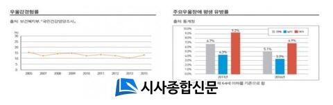 ƯÈ÷ ÁÖ¿ä¿ì¿ïÀå¾Ö(¿ì¿ïÁõ)ÀÇ Æò»ý À¯º´·üÀº 5.0%(Ñû 3.0%, Ò³ 6.9%), 1³â À¯º´·üÀº 1.5%(Ñû 1.1%, Ò³ 2.0%)·Î, Áö³ 1³â °£ ¿ì¿ïÁõÀ» °æÇèÇÑ »ç¶÷Àº 61¸¸ ¸í¿¡ À̸¦ °ÍÀ¸·Î º¸ÀδÙ. ƯÈ÷ À̹ø Á¶»ç¿¡¼´Â ÁÖ¿ä¿ì¿ïÀå¾ÖÀÇ ÀÏÁ¾ÀÎ »êÈÄ¿ì¿ïÁõÀ» óÀ½À¸·Î Ãß°¡ Á¶»çÇߴµ¥, Á¶»ç °á°ú ÁÖ¿ä ¿ì¿ïÀå¾Ö¸¦ °æÇèÇÑ ¼ºÀÎ ¿©¼º 10¸í Áß 1¸í(9.8%)Àº »êÈÄ¿ì¿ïÁõÀ¸·Î ¹àÇôÁ³´Ù.
