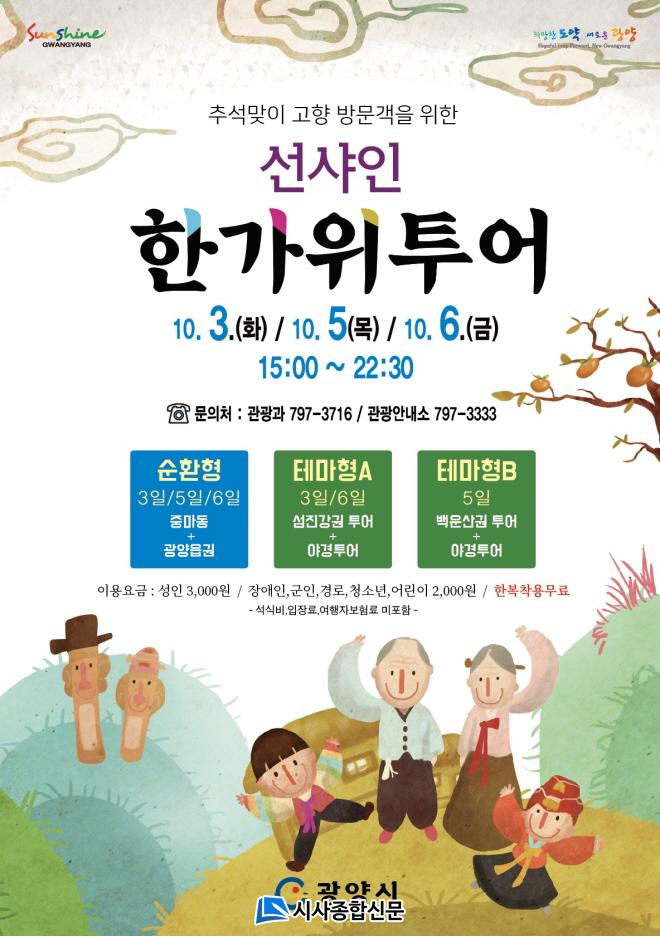 ±¤¾ç½Ã´Â ´õ¿í ¾ËÂù Åõ¾î¸¦ À§ÇØ ¹®ÈÇØ¼³Çؼ³»ç 2¸íÀ» °ü±¤¾È³»¼Ò¿¡ ¹èÄ¡ÇØ °ü±¤°´µé¿¡°Ô °ü±¤ÄÚ½º¿Í °ü±¤Áö¸¦ È«º¸ÇÒ °èȹÀ¸·Î, Åõ¾î¹ö½º ž½Â±ÇÀº ÇöÀå¿¡¼ ±¸ÀÔÇÒ ¼ö ÀÖÀ¸¸ç, ¿ä±ÝÀº ¼ºÀÎ 3,000¿ø, ÇлýÀº 2,000¿ø, ÇѺ¹Å¾½ÂÀÚ´Â ¹«·á´Ù. ´Ù¸¸ ¼®½Äºñ¿Í ÀÔÀå·á, ¿©ÇàÀÚº¸Çè·á´Â º»ÀÎÀÌ ºÎ´ãÇØ¾ß ÇÑ´Ù.
