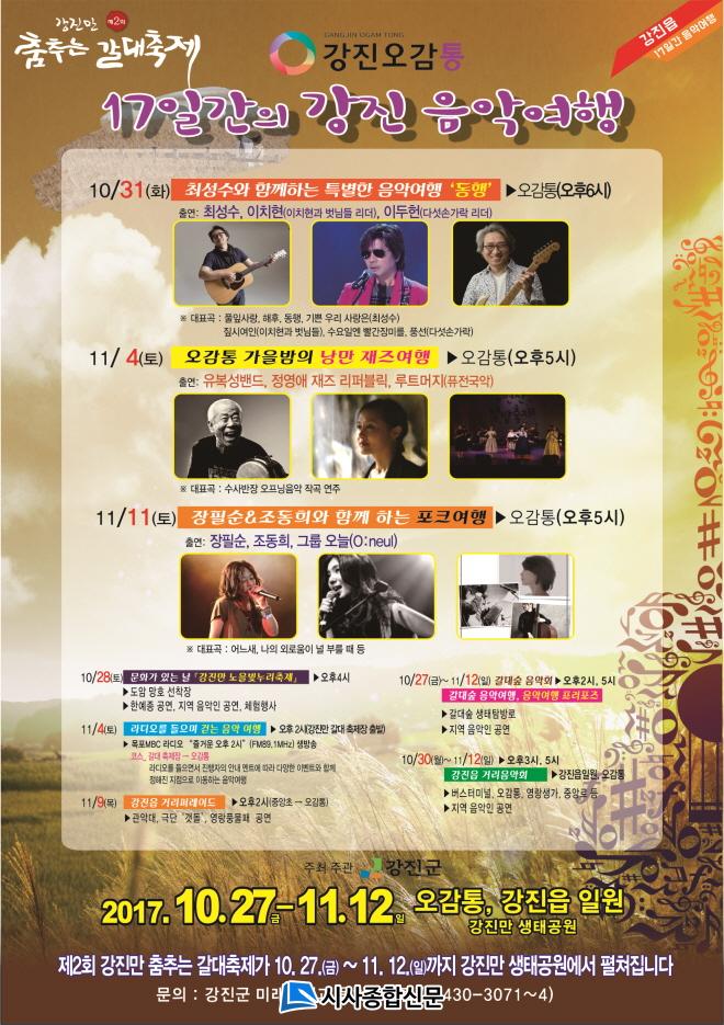 Áö¿ª À½¾ÇÀε鵵 À½¾Ç¿©Çà¿¡ µ¿ÂüÇÑ´Ù. °¥´ëÃàÁ¦ ±â°£ µ¿¾È °Áø¸¸ °¥´ë½£°ú °ÁøÀ¾ °÷°÷¿¡¼´Â Áö¿ª À½¾ÇÀεéÀÌ ²Ù¹Ì´Â ´Ù¾çÇÑ °Å¸®À½¾Çȸ°¡ ¿¸°´Ù. 11¿ù 9ÀÏ ¿ÀÈÄ 2½Ã¿¡´Â °ÁøÀ¾ Á߾ӷθ¦ Áß½ÉÀ¸·Î °ü¾Ç´ë¿Í dz¹°ÆÐ, ±×¸®°í Àü³² ´ëÇ¥ °ø¿¬¿¹¼úÀü¹® ±Ø´ÜÀÎ °¹µ¹ÀÌ °Å¸® °ø¿¬ ÆÛ·¹À̵带 ÆîÃÄ À½¾Ç¿©ÇàÀÇ °¨¼º°ú ºÐÀ§±â¸¦ ÇÑÃþ ²ø¾î¿Ã¸°´Ù. ƯÈ÷ °¹µ¹Àº ÆÛ·¹ÀÌµå °ø¿¬Â÷·®¿¡¼ 7080³ë·¡¸¦ °ø¿¬ÇØ Áß³âÃþ °ü°´µéÀ» ±× ½ÃÀý Ã߾←Çà¿¡ ÃÊ´ëÇÑ´Ù.