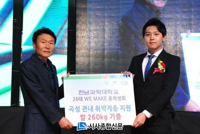 Àü³²°úÇдëÇб³ Á¦26´ë WE MAKE ÃÑÇлýȸ(ȸÀå Á¶ÀÎÈ£)Àº Áö³ 6ÀÏ ÃÑÇлýȸ Ãâ¹ü½Ä¿¡¼ ÇлýµéÀÌ Á¶¼ºÇÏ¿© ¸¶·ÃÇÑ ¹é¹Ì 260kgÀ» ±âÁõÇÏ¿© °î¼º±º °ü³» ¼Ò¿ÜµÇ°í ¾î·Á¿î Ãë¾à°èÃþ¿¡°Ô Àü´ÞÇß´Ù°í ¹àÇû´Ù.