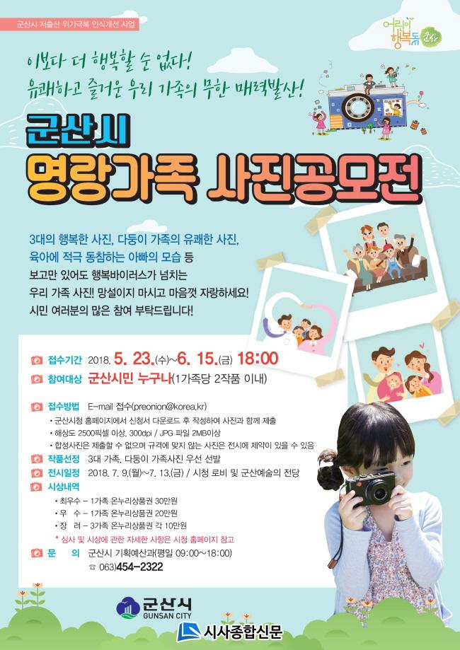 ¡®±º»ê½Ã ¸í¶û°¡Á· »çÁø °ø¸ðÀü¡¯Àº ±º»ê½Ã¹ÎÀ̶ó¸é ´©±¸³ª Âü¿© °¡´ÉÇϸç, 5¿ù 23ÀϺÎÅÍ 6¿ù 15ÀϱîÁö °¡Á·°ú ÇÔ²²ÇÏ´Â ÇູÇÑ ÀÏ»ó ¼Ó »çÁø 1~2Á¡À» ½Åû¼¿Í ÇÔ²² À̸ÞÀÏ(preonion@korea.kr)·Î Á¦ÃâÇÏ¸é µÈ´Ù.
