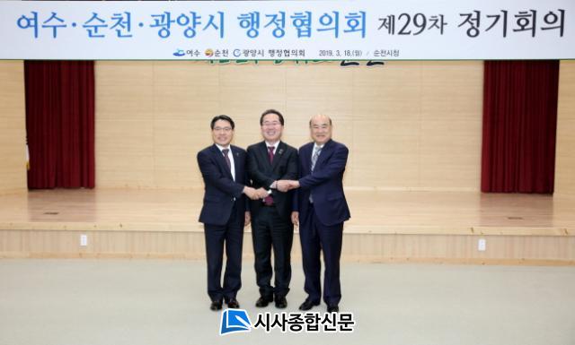 ¼øÃµ½Ãû ´ëȸÀǽǿ¡¼ ¿¸° À̳¯ ȸÀÇ¿¡´Â Á¤Çöº¹ ±¤¾ç½ÃÀå, ±Ç¿ÀºÀ ¿©¼ö½ÃÀå, Çã¼® ¼øÃµ½ÃÀåÀÌ Âü¼®Çß´Ù. 3°³½Ã ½ÃÀåÀº ±¤¾ç¸¸±Ç »ó»ý¹ßÀüÀ» À§ÇØ 6°ÇÀÇ ¿¬°è»ç¾÷À» ½Å±Ô ÃßÁøÇϰí, ¡®±¤¾çÇ×~À²ÃÌ»ê´Ü ¿¬°áµµ·Î °³¼³¡¯À» Á¤ºÎ¿¡ °øµ¿ °ÇÀÇÇϱâ·Î ÇÕÀÇÇß´Ù.