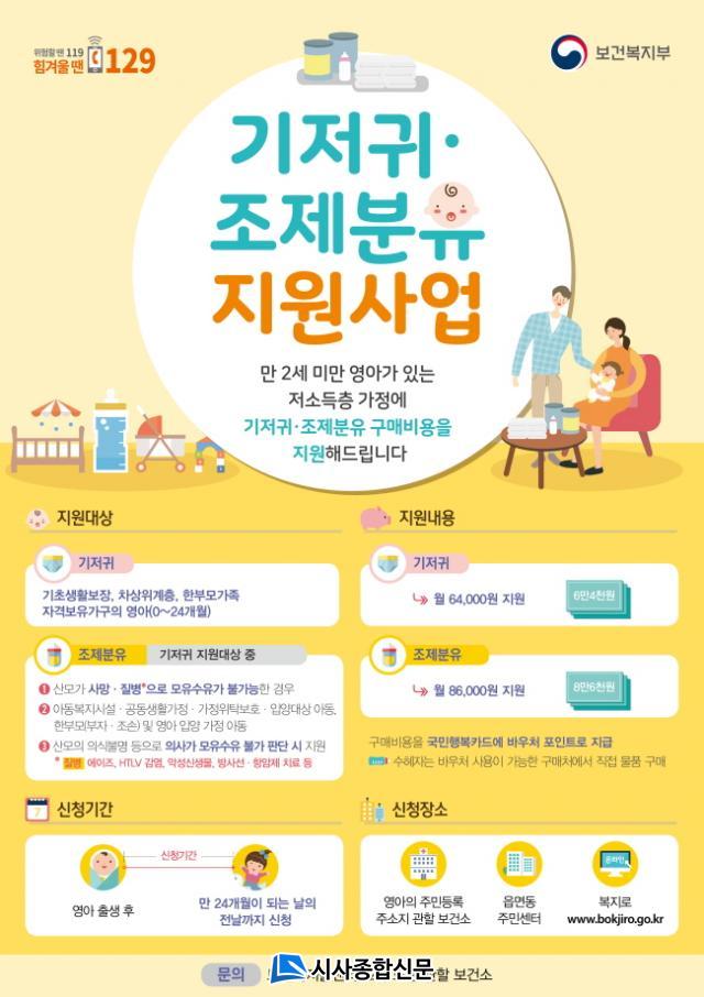 Áö¿ø±ÝÀº ±âÀú±Í´Â ¿ù 64,000¿ø, Á¶Á¦ºÐÀ¯´Â ¿ù 86,000¿øÀÌ¸ç µ¿½Ã Áö¿ø ¹ÞÀ» °æ¿ì ¿ù 150,000¿øÀ» Áö¿øÇÑ´Ù. ½Åû±âÇÑÀº ¿µ¾Æ Ãâ»ý ÈÄ ¸¸ 2³âÀÌ µÇ´Â ³¯ÀÇ Àü³¯±îÁöÀ̸ç, °üÇÒ º¸°Ç¼Ò ¸ðÀ¯¼öÀ¯½Ç, À¾?¸é?µ¿ ÇàÁ¤º¹Áö¼¾ÅÍ¿¡ ¹æ¹®Çϰųª ¿Â¶óÀο¡¼ ½Åû°¡´ÉÇÏ´Ù.