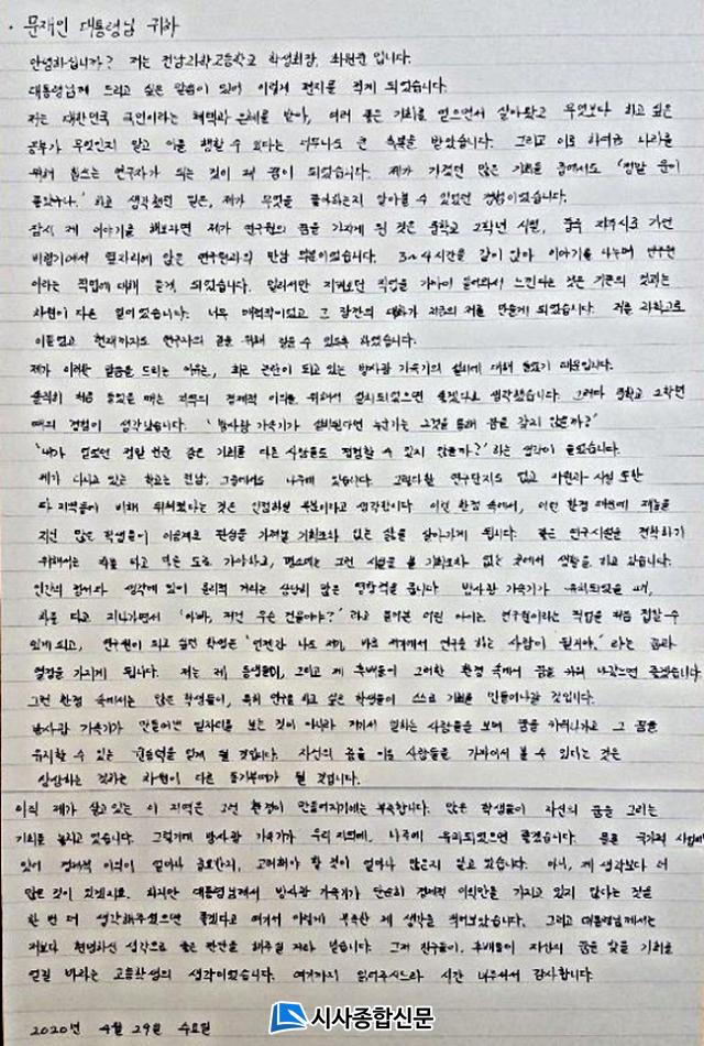 Àü³²°úÇаí ÇлýȸÀå ÃÖ¿øÁØ(3Çгâ) ±ºÀº ¡®¹®ÀçÀÎ ´ëÅë·É´Ô ±ÍÇÏ¡¯·Î ½ÃÀÛÇÏ´Â ÀÚÇÊÆíÁö¸¦ ÅëÇØ ¹æ»ç±¤°¡¼Ó±â ³ªÁÖ À¯Ä¡¿¡ ´ëÇÑ ¿°¿ø°ú ¹Ù¶÷À» ¹® ´ëÅë·É¿¡°Ô ÀüÇß´Ù.
