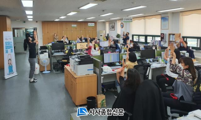 ¿ÀÇǽº ««ÀÌ °Ç°±³½ÇÀº ÄÄÇ»ÅÍ ¾Õ¿¡ ¾É¾Æ ÀÖ´Â »ç¹«Á÷ Á÷ÀåÀÎÀ» ´ë»óÀ¸·Î Æ´»õ ½Ã°£À» Ȱ¿ëÇÏ¿© ÄÄÇ»ÅÍÁõÈıº µîÀ¸·Î ½ÅüºÎÀ§º° °æÁ÷µÈ ±ÙÀ°À» Ç®¾îÁÖ¾î ÇǷΰ¨À» ÇØ¼ÒÇϱâ À§ÇÑ ¿îµ¿À» ½Ç½ÃÇÏ¿© ÀÚ¹ßÀû, Àû±ØÀûÀÎ Âü¿© ¼Ó¿¡ Å« È£ÀÀÀ» ¹Þ°í ÀÖ´Ù.