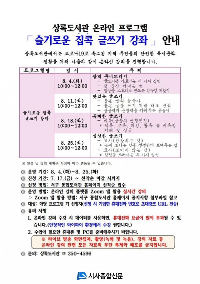ÇÁ·Î±×·¥Àº 8¿ù 4ÀϺÎÅÍ 8¿ù 25ÀϱîÁö ¸ÅÁÖ È¿äÀÏ ¿ÀÀü 10½Ã ÃÑ 4ȸÂ÷¿¡ °ÉÃÄ ⌜¾ö¸¶ÀÇ ±Û¾²±â⌟, ⌜ºÎ¸ð¿Í ¾ÆÀÌÀÇ ¼ÒÅë Àϱâ⌟ µîÀ» ¾´ ±Ç±ÍÇå ÀÛ°¡ÀÇ ½Ç½Ã°£ È»ó °ÀÇ·Î ÁøÇàµÈ´Ù.