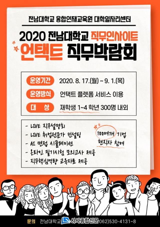 Àü³²´ë ´ëÇÐÀÏÀÚ¸®¼¾ÅÍ(¼¾ÅÍÀå ÀÌÀç¿)´Â ¿À´Â 8¿ù 17ÀϺÎÅÍ 9¿ù 1ÀϱîÁö ¾ðÅÃÆ® Ç÷§Æû ¼ºñ½º¸¦ Ȱ¿ëÇØ ¡®2020 Àü³²´ëÇб³ Á÷¹«ÀλçÀÌÆ® ¾ðÅÃÆ® Á÷¹«¹Ú¶÷ȸ¡¯¸¦ °¡Áø´Ù.