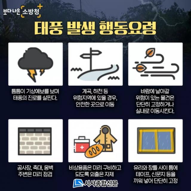 Çൿ¿ä·ÉÀ¸·Î´Â ¡ãÆ´Æ´ÀÌ ±â»ó¿¹º¸¸¦ º¸¸ç ÅÂdzÁø·Î »ìÇDZ⠡ã°è°î, ÇÏõ µî À§ÇèÁö¿ª¿¡ ÀÖ´Â °æ¿ì ¾ÈÀüÇÑ °÷À¸·Î À̵¿ ¡ã¹Ù¶÷¿¡ ³¯¾Æ°¥ À§ÇèÀÌ ÀÖ´Â ¹°°ÇÀº ´Ü´ÜÈ÷ °íÁ¤Çϰųª ½Ç³»·Î À̵¿ ¡ã°ø»çÀå, Ãà´ë, ¿Ëº® ÁÖº¯Àº ¹Ì¸®Á¡°Ë ¡ãºñ»ó¿ëǰÀº ¹Ì¸® ±¸ºñÇÏ°í µÇµµ·Ï ¿ÜÃâÀº ÀÚÁ¦ Çϱ⠡ãÀ¯¸®¿Í âƲ »çÀÌ Æ´¿¡ Å×ÀÌÇÁ, ½Å¹®Áö µîÀ» ³¢¿ö ´Ü´ÜÈ÷ °íÁ¤Çϱ⠵î ÀÌ´Ù.