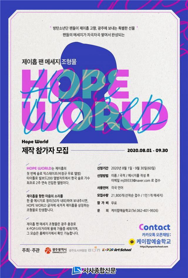 ±¤Áֽô ¼¼°è ¹æÅº¼Ò³â´Ü ÆÒµé°ú ÇÔ²² ±¤ÁÖ ÃæÀå·Î K-POP½ºÅ¸°Å¸®¿¡ ¡®HOPE WORLD¡¯ Á¦ÀÌÈ© ÆÒ ¸Þ½ÃÁö Á¶Çü¹°À» Á¶¼ºÅ°·Î Çϰí, 9¿ù30ÀϱîÁö 2¸¸1800°³ÀÇ ¸Þ½ÃÁö¸¦ ¸ðÀº´Ù´Â °èȹÀÌ´Ù.