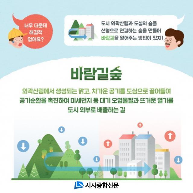 ¹Ù¶÷±æ½£Àº ¸¼°í Â÷°¡¿î °ø±â¸¦ µµ½ÉÀ¸·Î ²ø¾îµé¿© °ø±â¼øÈ¯À» À¯µµÇÏ°í ¹Ì¼¼¸ÕÁö µî ´ë±â¿À¿°¹°Áú°ú ¶ß°Å¿î °ø±â¸¦ ¹èÃâÇϱâ À§ÇØ µµ½Ã ¿Ü°û »ê¸²°ú µµ½Ã ³» »êÀçµÈ ½£À» ¼±ÇüÀ¸·Î ¿¬°áÇÑ ½£À» ¸»ÇÑ´Ù.
