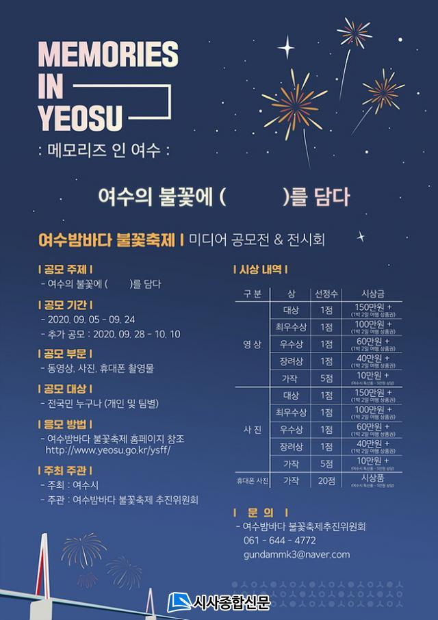 ÀÚ¼¼ÇÑ »çÇ×Àº ¿©¼ö¹ã¹Ù´Ù ºÒ²É ÃàÁ¦ ȨÆäÀÌÁö¸¦(http://www.yeosu.go.kr/ysff) Âü°íÇÏ¸é µÈ´Ù. ÇÑÆí ÃßÁøÀ§´Â 11¿ù ÃÊ ¿ª´ë(2016³â~2019³â) ºÒ²ÉÃàÁ¦ »çÁø °ø¸ðÀü ¼ö»óÀÛ °ú ÇÔ²² ¿ÃÇØ ¼ö»óÀÛÀ» Çѵ¥ ¸ð¾Æ Àü½Ãȸ¸¦ °³ÃÖÇÒ ¿¹Á¤ÀÌ´Ù.
