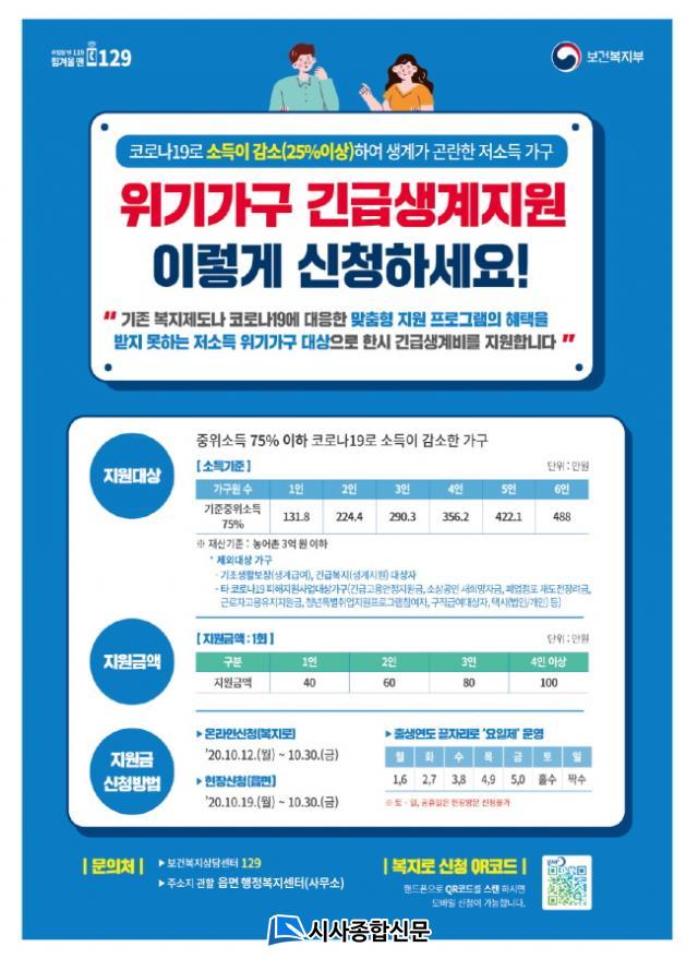 Áö±Þ ±Ý¾×Àº 1ÀÎ °¡±¸ 40¸¸ ¿ø, 2ÀÎ °¡±¸ 60¸¸ ¿ø, 3ÀÎ °¡±¸ 80¸¸ ¿ø, 4ÀÎ °¡±¸ ÀÌ»ó 100¸¸ ¿øÀÌ¸ç ¼Òµæ¡¤Àç»ê µî Á¶»ç¸¦ °ÅÃÄ 11¿ù Áß ½Åû°èÁ¿¡ Çö±ÝÀ¸·Î Áö±ÞµÈ´Ù.