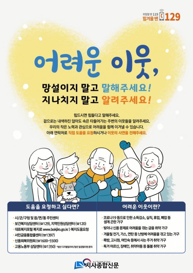 ÇÑÆí, ¸ñÆ÷½Ã °ü°èÀڴ¡°°Ü¿ïö »ýȰÀÌ ´õ¿í ¾î·Á¿öÁö´Â Ãë¾à°èÃþ¿¡°Ô ÀÛÀº °ü½ÉÀ̵û¶æÇÑ À§·Î°¡ µÈ´Ù¸ç, µµ¿òÀÌ ÇÊ¿äÇÑ °æ¿ì ¡â¸Á¼³ÀÌÁö ¸»°í ¡âÁö³ªÄ¡Áö ¸»°í ¡â129 ¶Ç´Â ÁÖ¼ÒÁö µ¿ ÇàÁ¤º¹Áö¼¾ÅÍ¿¡ µµ¿ò ¿äûÇÒ °Í¡±À» ´çºÎÇß´Ù.