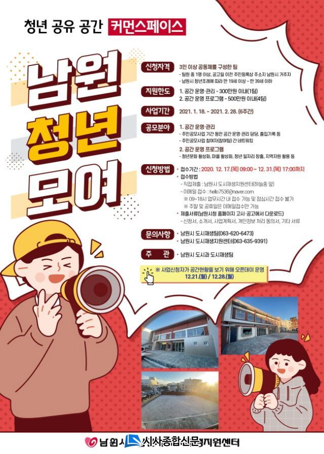 ½ÅûÀÚ°ÝÀº °ø°íÀÏ ÀÌÀü Áֹεî·Ï»ó ÁÖ¼ÒÁö°¡ ³²¿ø½ÃÀ̸ç, ¸¸ 19¼¼ ÀÌ»ó 39¼¼ ÀÌÇÏÀÇ Ã»³â 1ÀÎÀ» Æ÷ÇÔÇÑ 3¸í ÀÌ»ó °øµ¿Ã¼¸¦ ±¸¼ºÇÑ ÆÀÀÌ´Ù. Âü¿©¸¦ Èñ¸ÁÇϴ û³âÀº 2020³â 12¿ù 31ÀϱîÁö °ü·Ã ¼·ù¿Í »ç¾÷°èȹ¼¸¦ ÀÛ¼ºÇÏ¿© ³²¿ø½Ã µµ½ÃÀç»ýÁö¿ø¼¾ÅÍ·Î Á¢¼öÇÏ¸é µÇ°í, ÀÚ¼¼ÇÑ »çÇ×Àº ³²¿ø½Ãû ȨÆäÀÌÁö¸¦ ÅëÇØ È®ÀÎ ÇÒ ¼ö ÀÖ´Ù.
