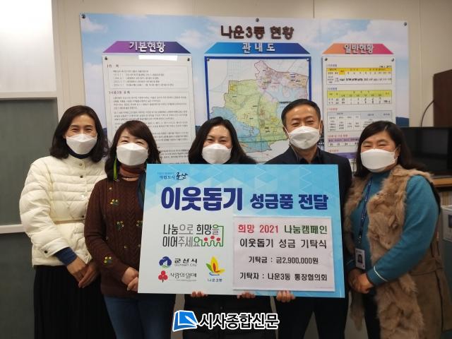[½Ã»çÁ¾ÇսŹ® = ³²Àç¿Á ±âÀÚ] ±º»ê½Ã ³ª¿î3µ¿Àº ÅëÀåÇùÀÇȸ°¡ ½ÅÃà³âÀ» ¸Â¾Æ ¾î·Á¿î ÀÌ¿ôµé¿¡°Ô ½á´Þ¶ó¸ç 6ÀÏ ÀÌ¿ôµ½±â¼º±Ý 290¸¸¿øÀ» Àü´ÞÇß´Ù°í ¹àÇû´Ù.