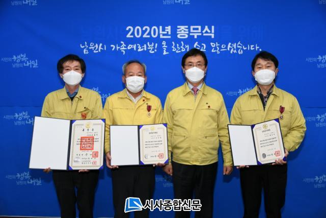 [½Ã»çÁ¾ÇսŹ® = ³²Àç¿Á ±âÀÚ] ³²¿ø½Ã Áֹκ¹Áö°ú Á¶È¯ÀÍ °úÀåÀÌ 2020³â ÇϹݱâ Á¤ºÎ ±¹Á¤ °¢ ºÐ¾ßÀÇ ¾÷¹«¸¦ ¼º½ÇÈ÷ ¼öÇàÇÏ¿© ±¹°¡°æÀï·Â °È µî¿¡ ±â¿©ÇÑ ¿ì¼ö °ø¹«¿ø¿¡ ´ëÇÑ Æ÷»óÀÚ·Î ³ìÁ¶±ÙÁ¤ÈÆÀåÀ» ¹Þ¾Ò´Ù.