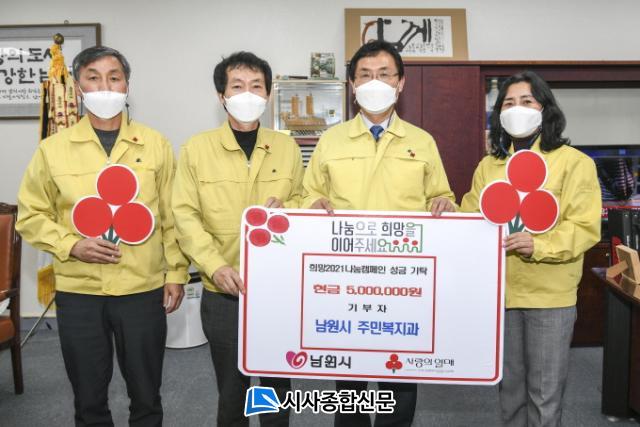 [½Ã»çÁ¾ÇսŹ® = ³²Àç¿Á ±âÀÚ] ³²¿ø½Ã¹ÎÀÇ º¹ÁöÇâ»óÀ» À§ÇØ °í±ººÐÅõÇϰí ÀÖ´Â Áֹκ¹Áö°ú¿¡¼ Áö³ 19ÀÏ ¾î·Á¿î ÀÌ¿ôÀ» À§ÇÑ ³ª´® »ç¾÷¿¡ ¾ÕÀå¼°íÀÚ Èñ¸Á2021 ³ª´®Ä·ÆäÀο¡ ¼º±Ý 500¸¸¿øÀ» ÄèôÇß´Ù.