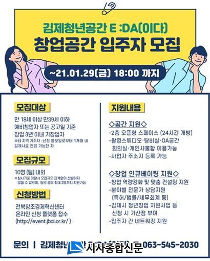 ÇÑÆí, ³²ºÏ10±æ 44(½Ådzµ¿)¿¡ Áö»ó 2Ãþ 415§³ ±Ô¸ð·Î Á¶¼º, Áö³ÇØ 10¿ù 27ÀÏ °³¼ÒÇÑ ¡º±èÁ¦Ã»³â°ø°£ E :DA(ÀÌ´Ù)¡»´Â Áö³ÇØ 11¿ù â¾÷°ø°£(2Ãþ) ÀÔÁÖÀÚ¸¦ 7ÆÀ 10¸íÀ» ¸ðÁý, ¸ÂÃãÇü â¾÷±³À° ¹× ¸àÅ丵 µîÀ» Áö¿øÇϰí ÀÖÀ¸¸ç ¿À´Â 2022³â±îÁö ÀüºÏâÁ¶°æÁ¦Çõ½Å¼¾ÅͰ¡ À§Å¹ ¿î¿µÇÑ´Ù.