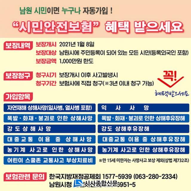 ³²¿ø½Ã¿¡ µû¸£¸é, ½Ã¹Î¾ÈÀüº¸ÇèÀº Àç³À̳ª ±× ¹ÛÀÇ °¢Á¾ »ç°í·Î ÇÇÇØ¸¦ ÀÔÀº ½Ã¹ÎÀÌ ¾ÈÁ¤À» µÇãÀ» ¼ö ÀÖµµ·Ï Áö¿øÇÏ´Â Á¦µµ·Î½á ³²¿ø½Ã¿¡ Áֹεî·ÏÀÌ µÇ¾îÀÖ´Â ¸ðµç ½Ã¹Î(µî·Ï¿Ü±¹ÀÎ Æ÷ÇÔ) 81,745¸íÀ» ´ë»óÀ¸·Î 2021. 1. 8ÀÏ Áö¹æÀçÁ¤°øÁ¦È¸¿¡ º¸Çè·á 3200¸¸¿øÀ» ³³ºÎÇÏ¿´´Ù.