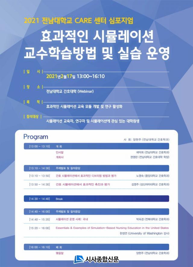 Àü³²´ë °£È£´ëÇÐ(ÇÐÀå ±Ç¿µ¶õ ±³¼ö)Àº ¿À´Â 2¿ù 17ÀÏ ¡®È¿°úÀûÀÎ ½Ã¹Ä·¹ÀÌ¼Ç ±³¼öÇнÀ¹æ¹ý ¹× ½Ç½À ¿î¿µ¡¯À̶ó´Â ÁÖÁ¦·Î ¡¸2021 Àü³²´ëÇб³ CARE CENTER ½ÉÆ÷Áö¾ö¡¹À» °³ÃÖÇÑ´Ù.