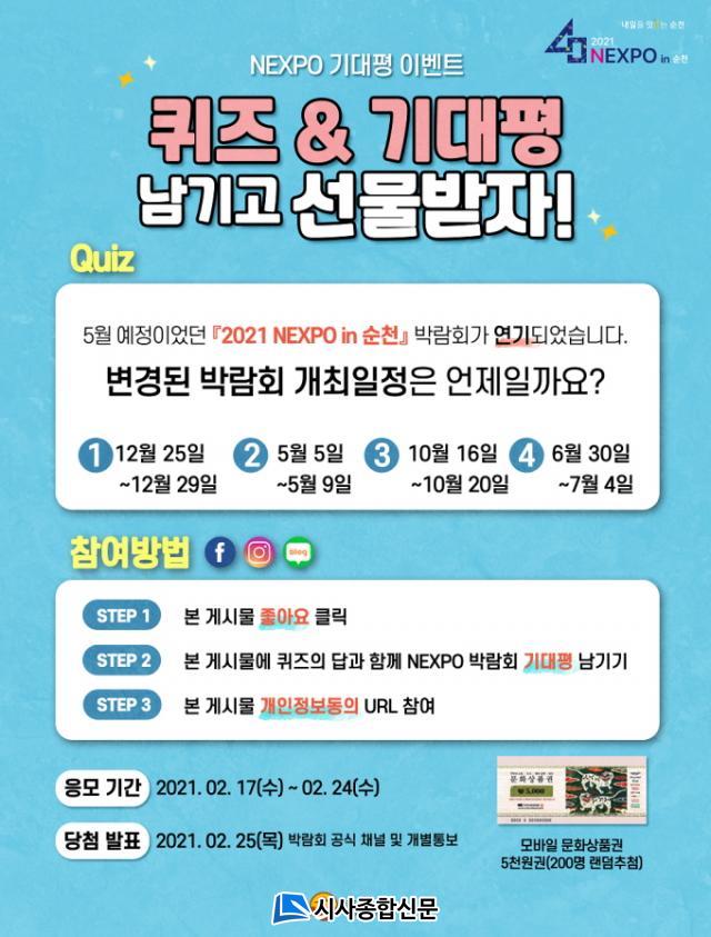 | ¼øÃµ½Ã, ¡®2021 NEXPO in ¼øÃµ¡¯ ÀÏÁ¤º¯°æ È«º¸ À̺¥Æ® ¿¾î ¡®2021 NEXPO in ¼øÃµ¡¯ ÄûÁî&±â´ëÆò ³²±â°í ¼±¹°¹ÞÀÚ!