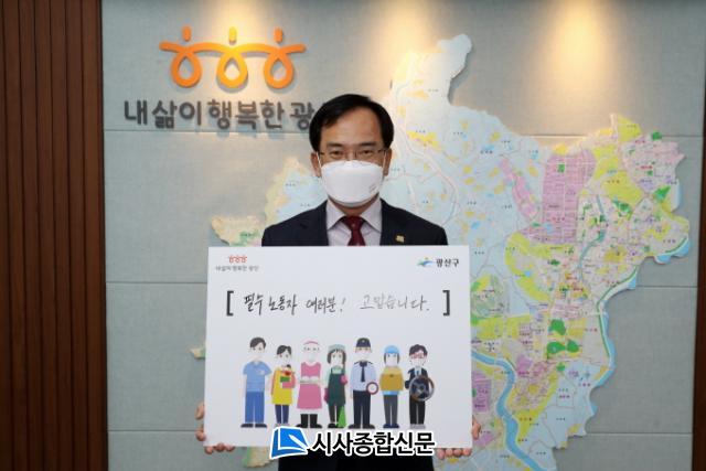 [½Ã»çÁ¾ÇսŹ® = ¿À½ÂÅà ±âÀÚ] ±è»ïÈ£ ±¤»ê±¸Ã»ÀåÀÌ Äڷγª19 »óȲ ¼Ó ´ë¸é ¾÷¹«¸¦ À̾°í ÀÖ´Â Çʼö³ëµ¿ÀÚµéÀ» ÀÀ¿øÇÏ´Â ¡®°í¸¿½À´Ï´Ù. Çʼö³ëµ¿ÀÚ¡¯ Ä·ÆäÀο¡ Âü¿©Çß´Ù.