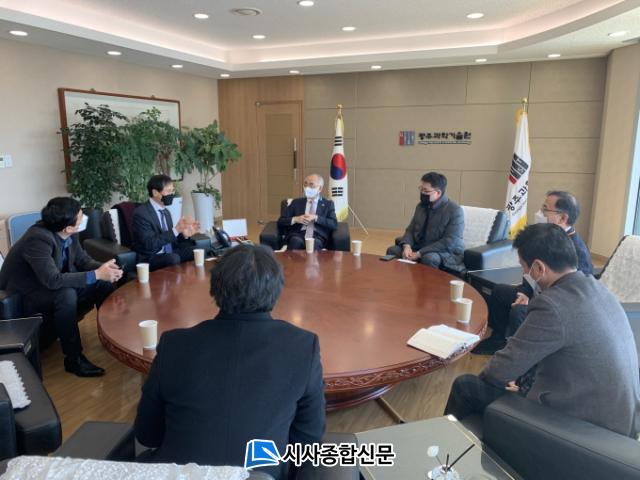 [½Ã»çÁ¾ÇսŹ® = ¿À½ÂÅà ±âÀÚ] ±¤ÁÖÀü³²Áö¹æÁß¼Òº¥Ã³±â¾÷û(ûÀå Àå´ë±³, ÀÌÇÏ Áß±âû)Àº ±¤ÁÖ°úÇбâ¼ú¿ø(ÃÑÀå ±è±â¼±)À» 19ÀÏ ¹æ¹®Çß´Ù. ±è±â¼± ÃÑÀå°ú ±èÁ¾¿ø ÀΰøÁö´É´ëÇпøÀåÀ» ¸¸³ª Áö¿ª ÀΰøÁö´ÉÀ¶º¹ÇÕ´ÜÁöÁ¶¼º»ç¾÷ ¹× ±â¼úâ¾÷ Ȱ¼ºÈ ¹æ¾È¿¡ ´ëÇØ ³íÀÇÇß´Ù.