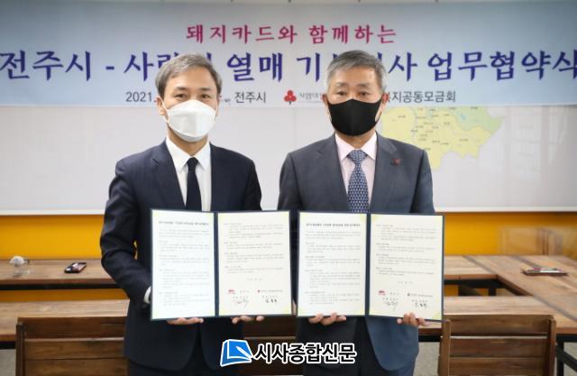ÀüÁÖ½Ã¿Í ÀüºÏ»çȸº¹Áö°øµ¿¸ð±Ýȸ(ȸÀå ±èµ¿¼ö)´Â 23ÀÏ ÀüÁÖ½ÃÀå½Ç¿¡¼ ¡®µÅÁöÄ«µå ±âºÎ¹®È Àå·Á¿îµ¿À» À§ÇÑ ¾÷¹«Çù¾à¡¯À» ü°áÇß´Ù.