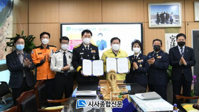 <»çÁø ¼³¸í> ±èº´³» ±¤ÁÖ ³²±¸Ã»Àå°ú Á¤¼±¸ð ³²ºÎ¼Ò¹æ¼ÀåÀº 24ÀÏ ¿ÀÀü ±¸Ã»¿¡¼ ¡®¼Ò¹æ¾ÈÀü¸Á ±¸Ãà Çù¾à¡¯À» ü°áÇß´Ù. ¾ç ±â°üÀº ´ëÃ̵¿¿¡ ÈÀç¾ø´Â ¾ÈÀü¸¶À»À» ¸¸µå´Âµ¥ ÈûÀ» ¸ðÀ» ¹æÄ§ÀÌ´Ù.