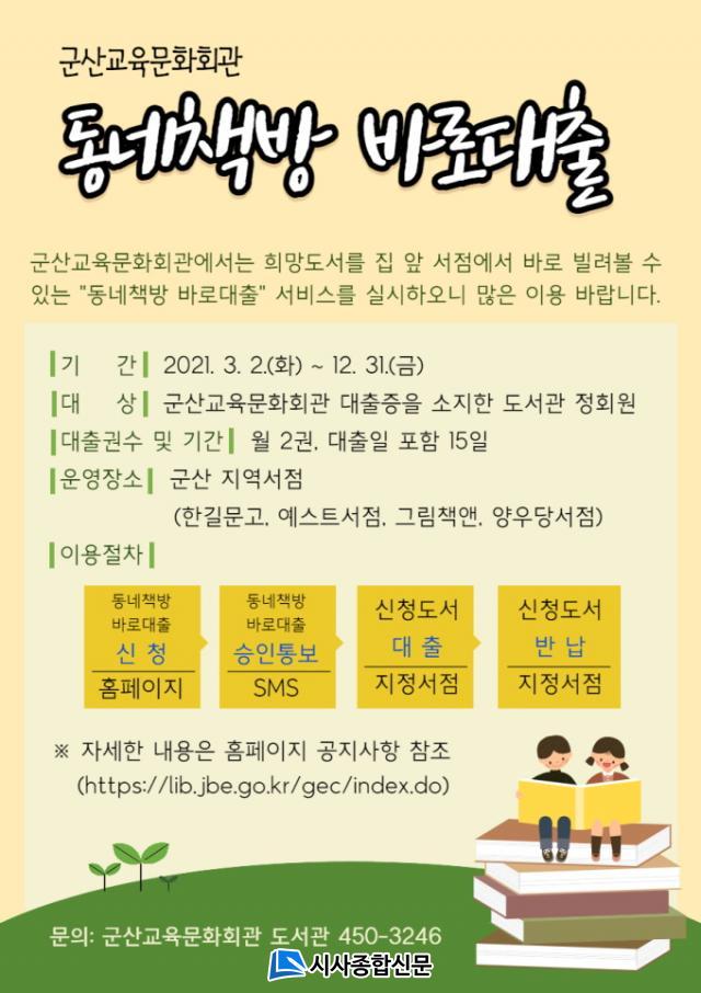 [½Ã»çÁ¾ÇսŹ® = ³²Àç¿Á ±âÀÚ] ±º»ê±³À°¹®Èȸ°ü(°üÀå ±è¸íÈñ)¿¡¼´Â ÀÌ¿ëÀÚ°¡ Èñ¸ÁÇÏ´Â µµ¼¸¦ °¡±î¿î Áö¿ª¼Á¡¿¡¼ ºô·Áº¼¼ö ÀÖ´Â ¡®µ¿³×Ã¥¹æ ¹Ù·Î´ëÃ⡯ ¼ºñ½º¸¦ Áö³ 2ÀϺÎÅÍ ¿î¿µÇß´Ù°í ¹àÇû´Ù.