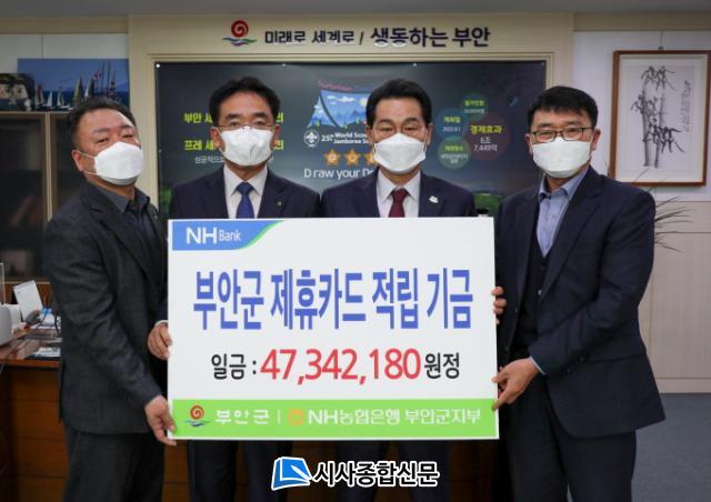 [½Ã»çÁ¾ÇսŹ® = ³²Àç¿Á ±âÀÚ] NH³óÇùÀºÇà ºÎ¾È±ºÁöºÎ(ÁöºÎÀå Á¶Àΰ©)´Â 9ÀÏ(È) ±º¼ö½Ç¿¡¼ Á¦ÈÞÄ«µå »ç¿ëÀ¸·Î Á¶¼ºµÈ 4,700¸¸¿øÀÇ ±â±ÝÀ» ºÎ¾È±º ¹ßÀüÀ» À§ÇØ ½á ´Þ¶ó¸ç ºÎ¾È±º(±º¼ö ±ÇÀÍÇö)¿¡ Àü´ÞÇß´Ù.