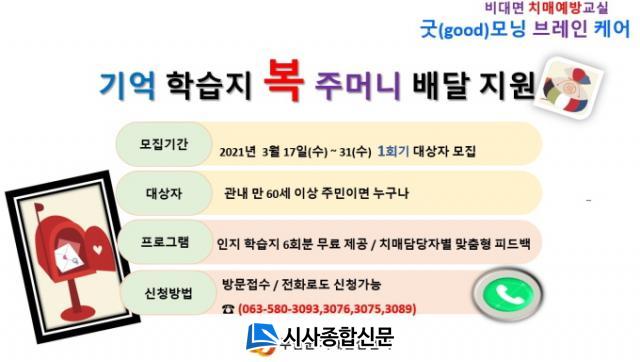 [½Ã»çÁ¾ÇսŹ® = ³²Àç¿Á ±âÀÚ] ºÎ¾È±º Ä¡¸Å¾È½É¼¾ÅÍ´Â 2021³â 3¿ù 17(¼ö)ÀÏ ºÎÅÍ~3¿ù 31(¼ö)±îÁö °ü³» ¸¸ 60¼¼ ÀÌ»ó ¾î¸£½ÅÀ» ´ë»óÀ¸·Î ±â¾ï ÇнÀÁö º¹ ÁÖ¸Ó´Ï ¹è´ÞÁö¿ø Âü¿©ÀÚ¸¦ ¸ðÁýÇÑ´Ù.