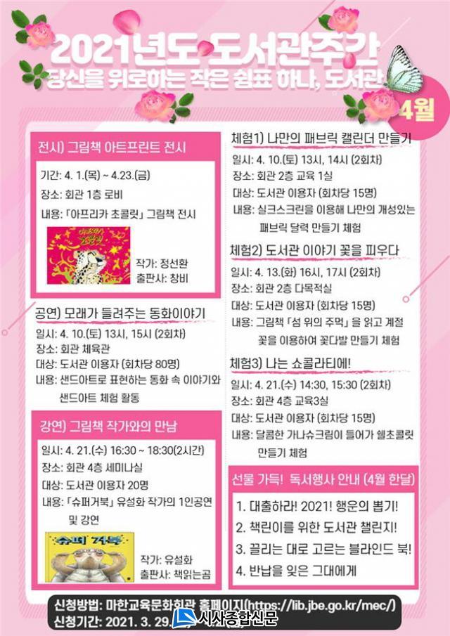 ÇÑÆí, µµ¼°ü ÁÖ°£¿¡ ´ëÇÑ ÀÚ¼¼ÇÑ ÀÏÁ¤ ¾È³»¿Í ½Åû¹æ¹ýÀº ¸¶Çѱ³À°¹®Èȸ°ü ´©¸®Áý(https://lib.jbe.go.kr/mec/)¿¡¼ È®ÀÎÇÒ ¼ö ÀÖÀ¸¸ç ±³À°¹®È°ú(¢Ï840-7227)·Î ¹®ÀÇÇÏ¸é µÈ´Ù.