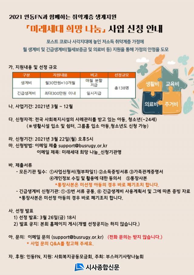 Àε¿FN°ú ÇÔ²²ÇÏ´Â Ãë¾à°èÃþ »ý°èÁö¿ø ¡®¹Ì·¡¼¼´ë Èñ¸Á ³ª´®¡¯ »ç¾÷Àº Äڷγª·Î »ç°¢Áö´ë¿¡ ³õÀÎ Àú¼Òµæ Ãë¾à°èÃþ °¡Á¤¿¡ ¿ù »ý°èºñ¿Í ±ä±Þ »ý°èºñ¸¦ Áö¿øÇÏ´Â »ç¾÷ÀÌ´Ù. Àü±¹¿¡¼ ÃÑ 138¸íÀ» ¼±Á¤ÇØ 1Àδç 300¸¸ ¿øÀÇ »ý°èºñ¸¦ Áö¿øÇÑ´Ù.