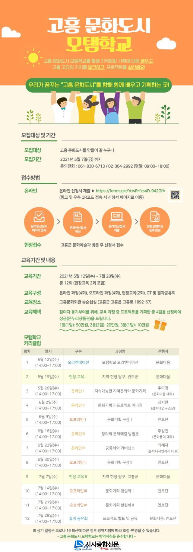 Âü¿©´ë»óÀº °íÈï ¹®Èµµ½Ã¸¦ ¸¸µé¾î °¥ ´©±¸³ª Âü¿© °¡´ÉÇϸç, Âü¿© ½ÅûÀº 5¿ù 7ÀϱîÁö ¿Â¶óÀÎ Âü°¡µî·Ï½Åû¼(http://forms.gle/YcwRrfzs4Fu942GfA), ¿ÀÇÁ¶óÀÎ Âü°¡µî·Ï½Åû¼(°íÈﱺû ¹®È¿¹¼ú°ú 061-830-6713)¸¦ Á¦ÃâÇÏ¸é µÈ´Ù.