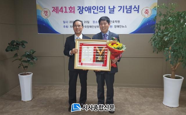 [½Ã»çÁ¾ÇսŹ® = ¿À½ÂÅà ±âÀÚ] ±è±¤Ã¶ Àü¶ó³²µµ »çȸÀç³°ú ¿øÀü¾ÈÀüÆÀÀåÀÌ ÀÚ¶û½º·¯¿îÇѱ¹Àå¾ÖÀλóÀ§¿øÈ¸¿¡¼ ÁÖÃÖÇÑ Á¦41ȸ Àå¾ÖÀÎÀdz¯ ½Ã»ó¿¡¼ ¡®»çȸº¹ÁöºÐ¾ß¡¯ ¼ö»óÀÚ·Î ¼±Á¤µÅ ǥâÀåÀ» ¼ö¿© ¹Þ¾Ò´Ù.