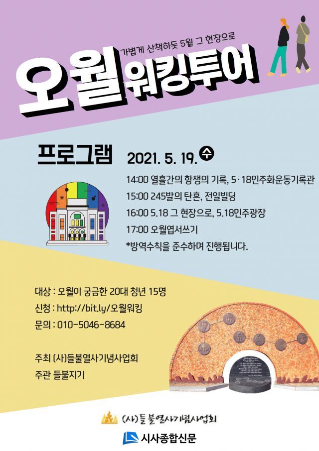 ±â³ä»ç¾÷ȸ´Â ¿À´Â 2021³â 5¿ù 19ÀÏ ¼ö¿äÀÏ 5•18 41ÁÖ³âÀ» ¸ÂÀÌÇÏ¿©, û³âµé°ú ÇÔ²² 5.18»çÀûÁö¸¦ ´ä»çÇÏ´Â ¡®¿À¿ù¿öÅ·Åõ¾î¡¯¸¦ ÁøÇàÇÑ´Ù. ±¤ÁÖ¿¡ »ì¾Æ°¡°í ÀÖÁö¸¸ »çÀûÁö °ßÇÐÀ» ÇØº» ÀûÀÌ ¾ø°Å³ª, ÇÔ²² ¾Ë¾Æ°¡°íÀÚ ÇÏ´Â µ¿·áµéÀ» ã´Â ±¤ÁÖ 20´ë û³âµéÀ» ´ë»óÀ¸·Î ¸ðÁýÀ» ÁøÇàÇϰí ÀÖ´Ù.