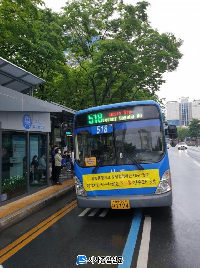 ÀÌ¿¡ ´ë±¸½Ãµµ ±¤ÁÖ½ÃÀÇ 2¡¤28 ¹ÎÁÖȿ È«º¸¿¡ °¨»çÇÏ°í ´ë±¸-±¤ÁÖ, ´Þºû»ó»ýÇù·ÂÀ» ÇÑÃþ ´õ °ÈÇϱâ À§ÇØ 518¹ø ½Ã³»¹ö½º 17´ë¸¦ Ȱ¿ëÇØ ¡®´Þºûµ¿¸ÍÀ¸·Î »ó»ýÇù·ÂÇÏ´Â ´ë±¸-±¤ÁÖ, ÆòÈ·Î ÇϳªµÇ´Â 5¡¤18 ¹ÎÁÖÈ ¿îµ¿¡¯, ¡®2¡¤28°ú 5¡¤18·Î ÇϳªµÇ´Â ´ë±¸-±¤ÁÖ¡¯¶ó´Â È«º¸¹°À» ½Ã³»¹ö½º ¿ÜºÎ 3¸é(Àü¡¤Èĸé, Ãø¸é)¿¡ ºÎÂø, ±â³äÀÏ Àü¡¤ÈÄ 7Àϰ£(5.17.~5.23.) ½Ã¹Îµé¿¡°Ô È«º¸ÇÑ´Ù.