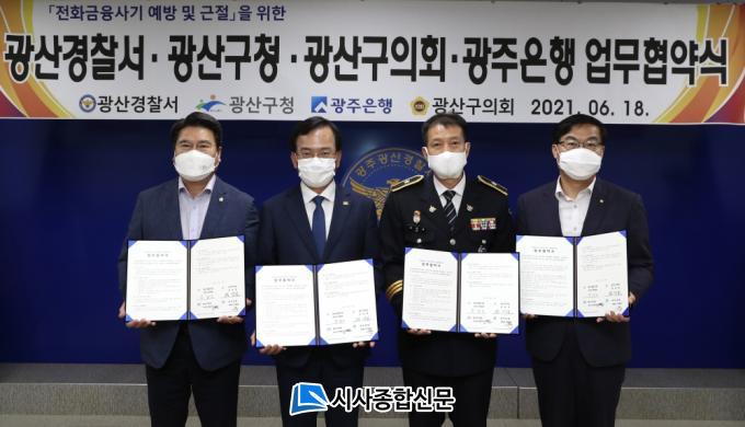 »çÁø¼³¸í=±è»ïÈ£ ±¤»ê±¸Ã»ÀåÀÌ 18ÀÏ ¿ÀÀü ±¤»ê°æÂû¼, ±¤»ê±¸ÀÇȸ, ±¤ÁÖÀºÇà°ú ±ÝÀ¶»ç±â ÇÇÇØ ¿¹¹æ ¾÷¹«Çù¾àÀ» ü°áÇÑ µÚ ±â³ä»çÁøÀ» ÃÔ¿µÇϰí ÀÖ´Ù. ¿ÞÂʺÎÅÍ ¹ÚÇö¼® ±¤»ê±¸ÀÇȸ ºÎÀÇÀå, ±è»ïÈ£ ±¤»ê±¸Ã»Àå, ±è±¤³² ±¤»ê°æÂû¼Àå, À̱¤È£ ±¤ÁÖ
