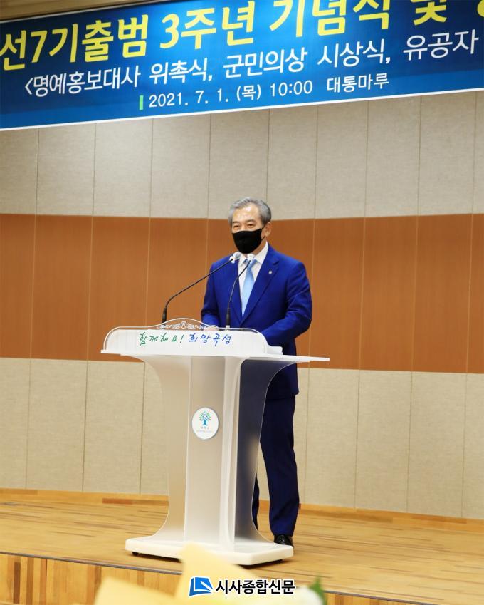 1ÀÏ 10½Ã °î¼º±º ´ëÅ븶·ç¿¡¼ ¹Î¼± 7±â 3Áֳ⠱â³ä½ÄÀÌ ÁøÇàµÆ´Ù. Æò»ó½Ã ¿ù·ÊÁ¶È¸¿Í Å©°Ô ´Ù¸¦ °Í ¾øÀÌ °£¼ÒÇÏ°Ô ÁøÇàµÈ ±â³ä½Ä¿¡¼ À¯±Ù±â ±º¼ö´Â ¹Î¼± 7±â ÁÖ¿ä ¼º°ú¿Í ¾ÕÀ¸·ÎÀÇ °èȹÀ» ¹àÇû´Ù.