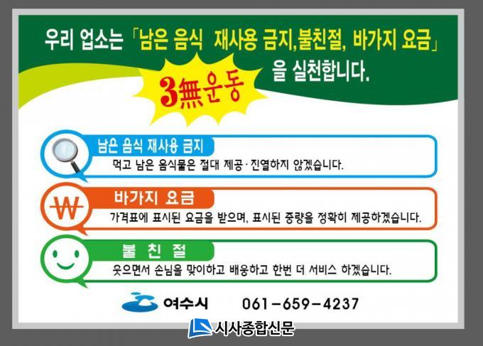 Àü³² ¿©¼ö½Ã(½ÃÀå ±Ç¿ÀºÀ)°¡ Áö³ 20ÀϺÎÅÍ °ü³» 4õ300°³¼Ò À½½ÄÁ¡¿¡ ´ëÇØ ¡®ÀÜ¹Ý Àç»ç¿ë, ºÒÄ£Àý, ¹Ù°¡Áö¿ä±Ý¡¯À» ±ÙÀýÇÏ´Â 3¹«(Ùí)¿îµ¿¿¡ µ¹ÀÔÇß´Ù.