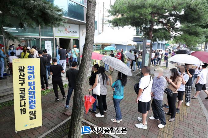 »çÁø¼³¸í=Áö³ 23ÀÏ ¿Ü±¹ÀÎÁֹεéÀÌ Äڷγª19 ¹é½Å Á¢Á¾À» À§ÇÑ °ü¸®¹øÈ£¸¦ ¹ß±Þ ¹Þ±â À§ÇØ ±¤»ê±¸Ã» ¾Õ¿¡ ÁÙÀ» ¼ ÀÖ´Â ¸ð½À.